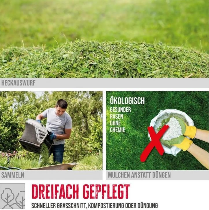 - zum Mulchen kein Messerwechsel erforderlich, Mulchstopfen im Lieferumfang enthalten