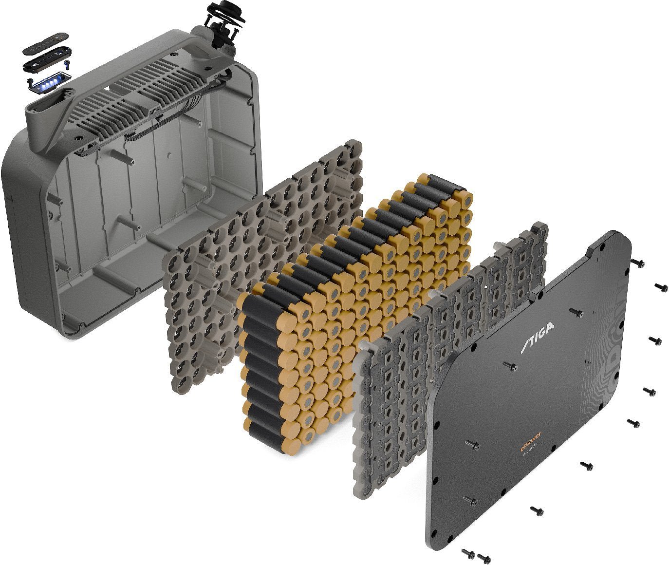 Maximale Flexibilität: Dank des modularen Systems ist der Akku tragbar und zwischen verschiedenen STIGA Profi-Geräten austauschbar.