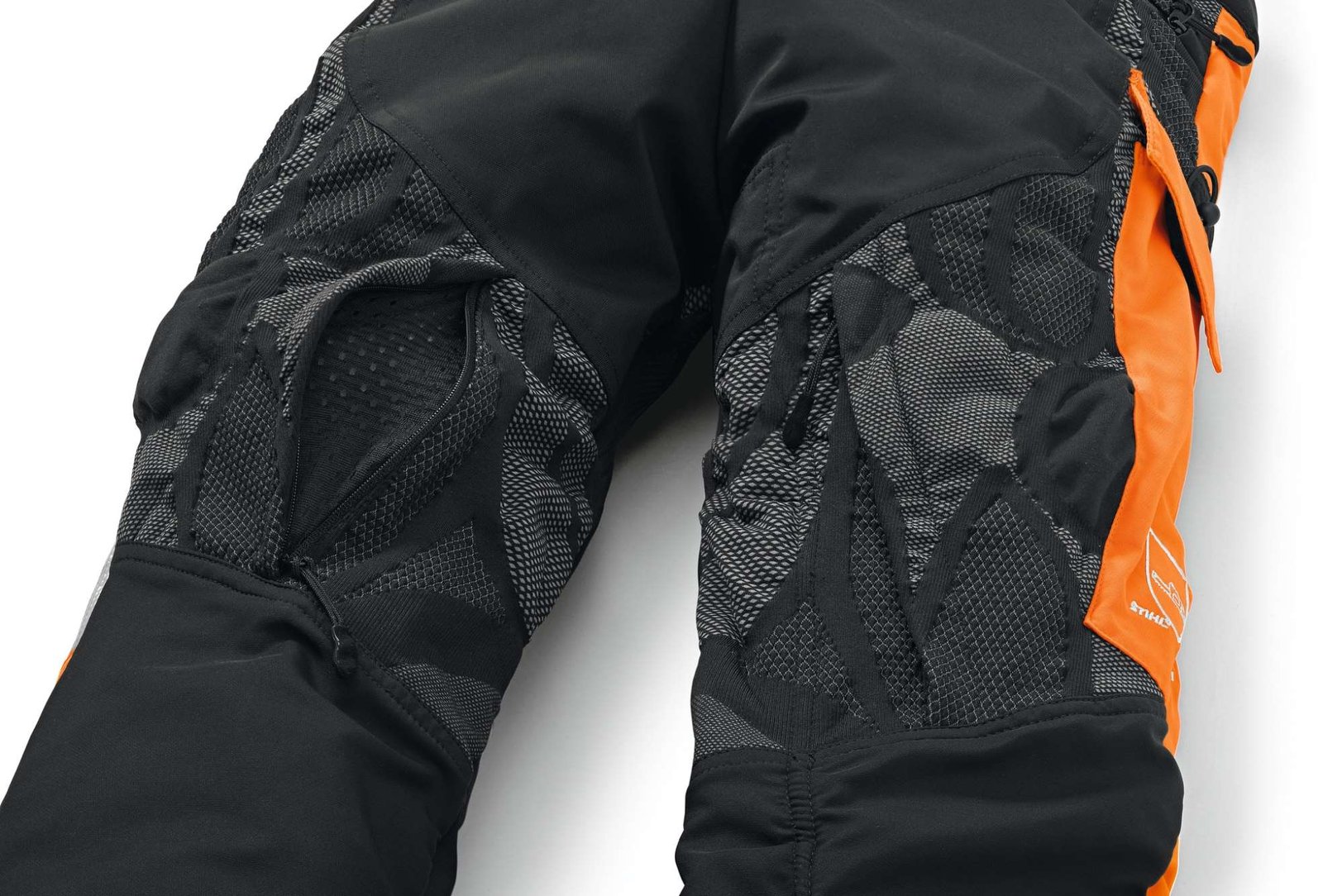 Im Schritt wird der Schnittschutz nicht zusammengenäht sondern durch einen elastischen Einsatz verbunden, der sich selbst bei extremen Ausfallschritten optimal dehnt. |